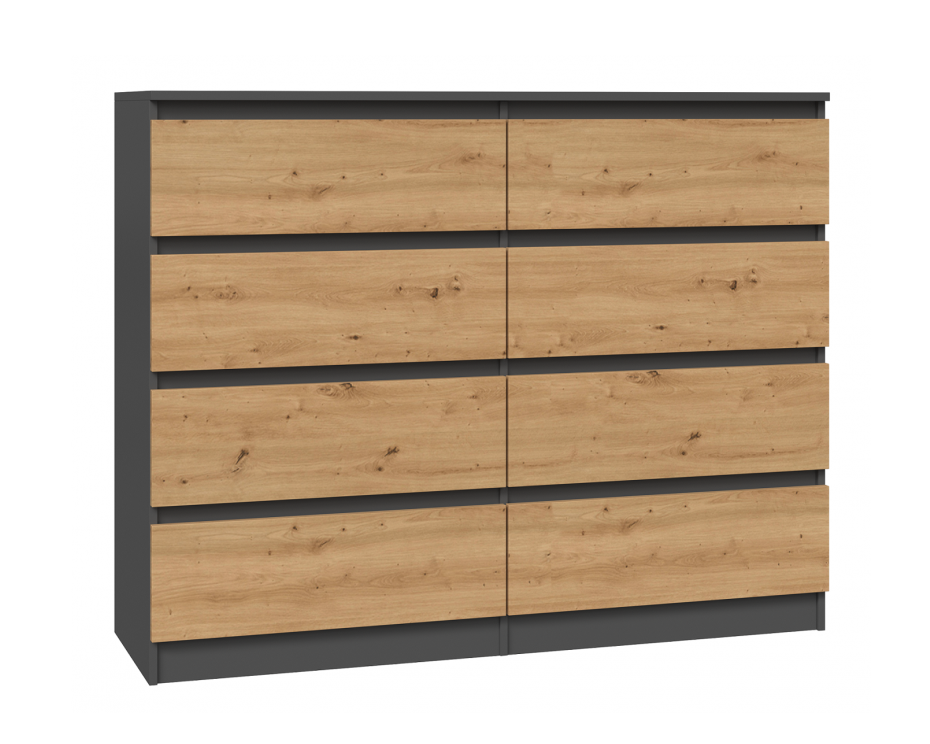 Komoda z serii Isla jest dość dużym meblem o szerokości 120 centymetrów. Taki rozmiar umożliwia przechowywanie w niej dużej ilości ubrań i innych potrzebnych do życia rzeczy. Szuflady poruszające się na niezawodnych prowadnicach sprawiają, że korzystanie z mebla jest czystą przyjemnością. Jeżeli dodamy do tego fakt, że do jego czyszczenia wystarczy wilgotna szmatka, tworzy się obraz mebla, który służyć nam będzie bardzo długo bez uszczerbku na jego funkcjonalnych i estetycznych walorach.