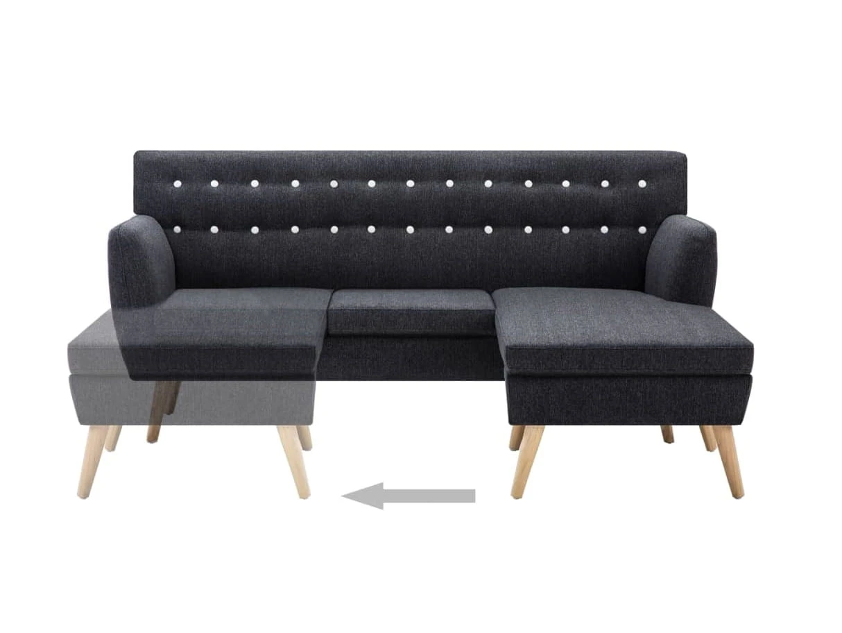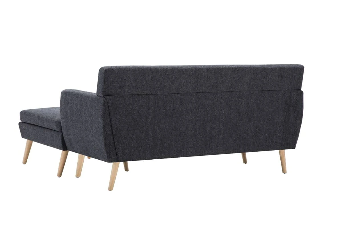 Szara pikowana sofa z leżanką na drewnianych nóżkach