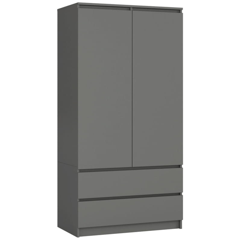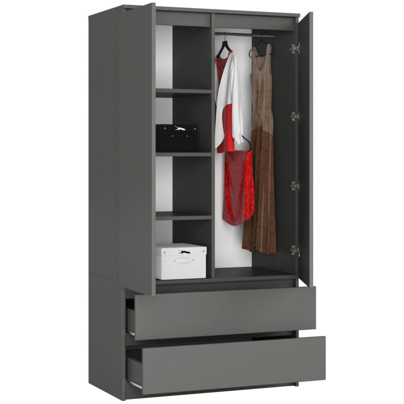 Dorian wyróżnia się pojemnością, przestrzenią idealną do przechowywania ubrań, a to dzięki dwóm szufladom, wieszakowi oraz czterem praktycznym półkom ukrytym za drzwiami szafy. Wykonany z wysokiej jakości materiałów korpus stworzono z odpornej na ścieranie płyty laminowanej, zaś metalowe prowadnice szuflad zapewniają płynne otwieranie i domykanie.