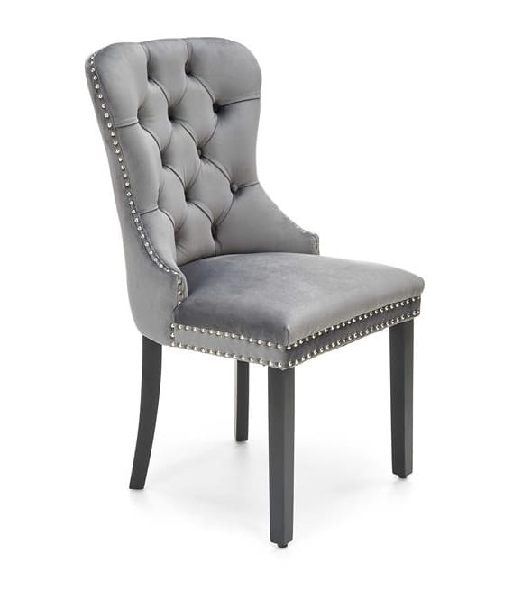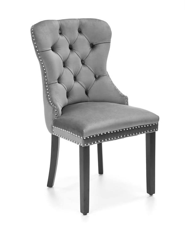 Oczywiście jest to model nowoczesny, jednak nie brakuje mu odniesień do nurtu kojarzonego ze splendorem i elegancją. Siedzisko i oparcie mają niebanalny, opływowy kształt. A poza tym mamy tu do czynienia z bardzo pięknym wykończeniem. Siedzisko tapicerowane jest niezwykle przyjemną w dotyku, welurową tkaniną w żywym kolorze. Wysokie oparcie bez podłokietników wzbogacono o efektowne, równomierne pikowania. Wokół bryły krzesła zastosowano połyskujące pinezki, nadając mu swoistego blichtru. Całość dopełnia kołatka! Model ten wyróżnia się i robi wrażenie!