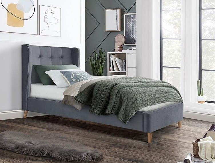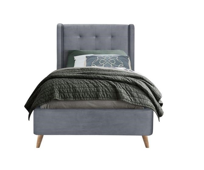 Szare jednoosobowe łóżko z zagłówkiem
