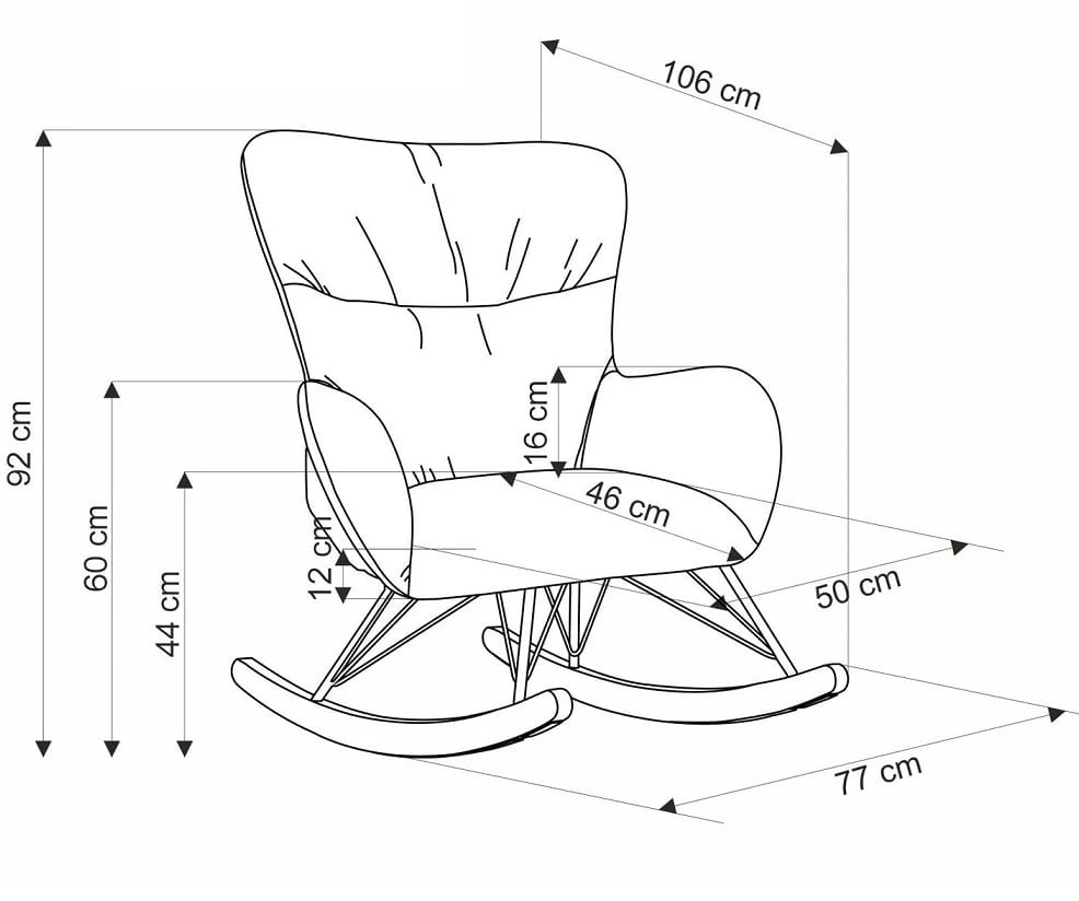 - Wymiary: szerokość - 77 cm, wysokość - 106 cm, wysokość siedziska - 44 cm, głębokość - 92 cm