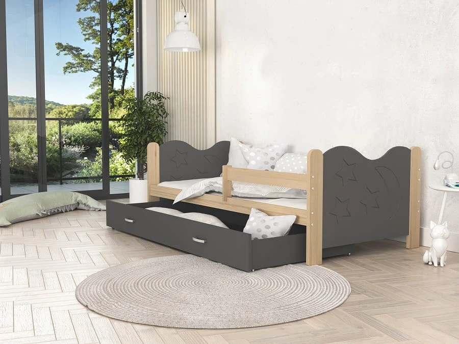 Łóżko dziecięce wyposażone w wysuwaną i pojemną szufladę na kółkach daje możliwość przechowywania pościeli i akcesoriów do spania jak np. koce, poduszki, zabawki. To istotne, szczególnie, ze dzieci traktują łóżka nie tylko jako miejsce wypoczynku, ale i przestrzeń do zabawy. Jakość wykonania, funkcjonalność i wzornictwo świetnie ze sobą współgrają.