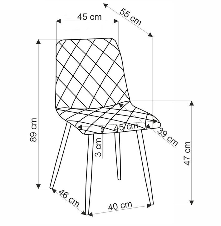 - Wymiary: szerokość - 45 cm, głębokość - 55 cm wysokość - 89 cm, wysokość siedziska - 47 cm