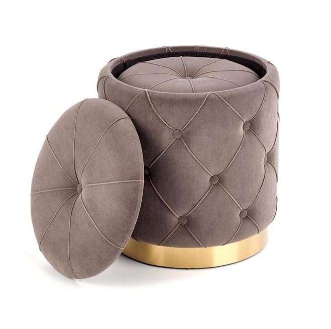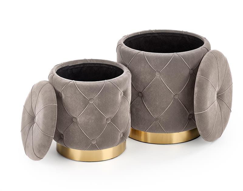 Eleganckie, okrągłe pufy wyróżniają się ekstrawagancką, złotą podstawą wykonaną ze stali nierdzewnej, która nadaje im wytwornego sznytu. Ta stabilna rama odporna jest na korozję i przetarcia. Natomiast okrągłe siedzisko tapicerowane jest miękką, wysokogatunkową, przyjemną w dotyku tkaniną w kolorze popielatym i z przeszyciami i pikowaniem. Ze względu na minimalistyczną formę, tak w designie, jak i w wymiarach - pufy Queens sprawdzą się jako ozdobny dodatek do salonu, sypialni, gabinetu czy też do nowoczesnego biura. Również jako doposażenie damskiej toaletki. Świetnie wzbogacą też przestrzenie użyteczności publicznej, jak np. hotele, poczekalnie.