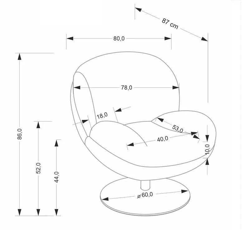 - Wymiary: szerokość - 80 cm, głębokość - 87 cm, wysokość - 86 cm, wysokość siedziska - 44 cm
