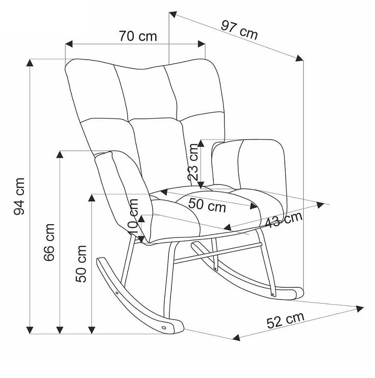 - Wymiary: szerokość - 70 cm, wysokość - 94 cm, wysokość siedziska - 50 cm, głębokość - 97 cm