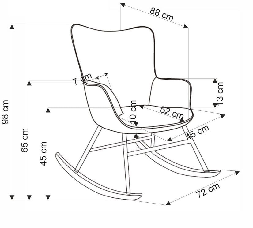 - Wymiary: szerokość - 72 cm, wysokość - 98 cm, wysokość siedziska - 45 cm, głębokość - 88 cm
