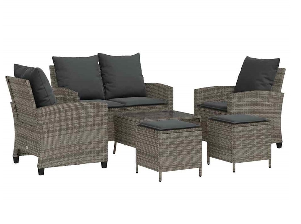 - Zestaw zawiera: 2-osobowa sofa, stolik kawowy, 2x fotel, 2x podnóżek, poduszki