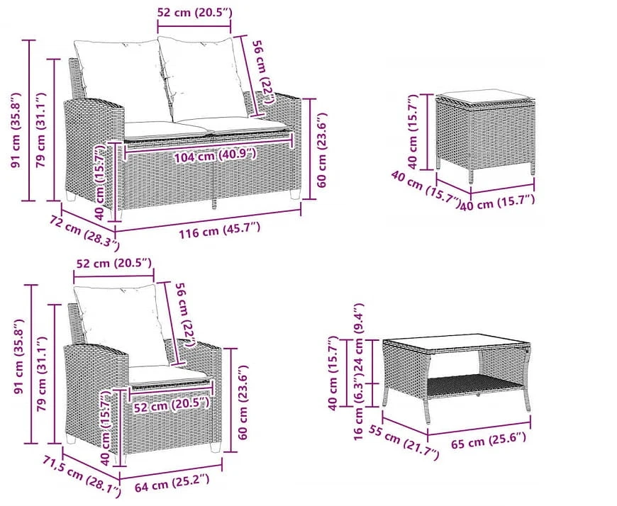 - Wymiary (szer. x gł. x wys.): sofa - 116 x 72 x 79 cm, fotel - 64 x 71,5 x 79 cm, stolik - 65 x 55 x 40 cm, podnóżek - 40 x 40 x 40 cm