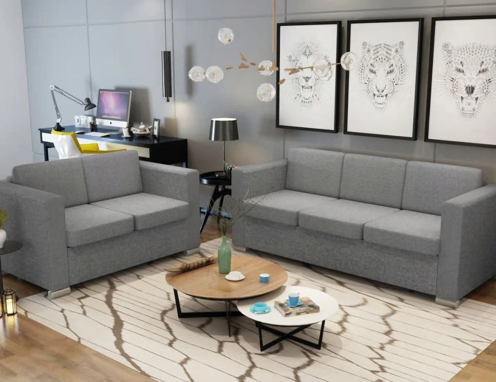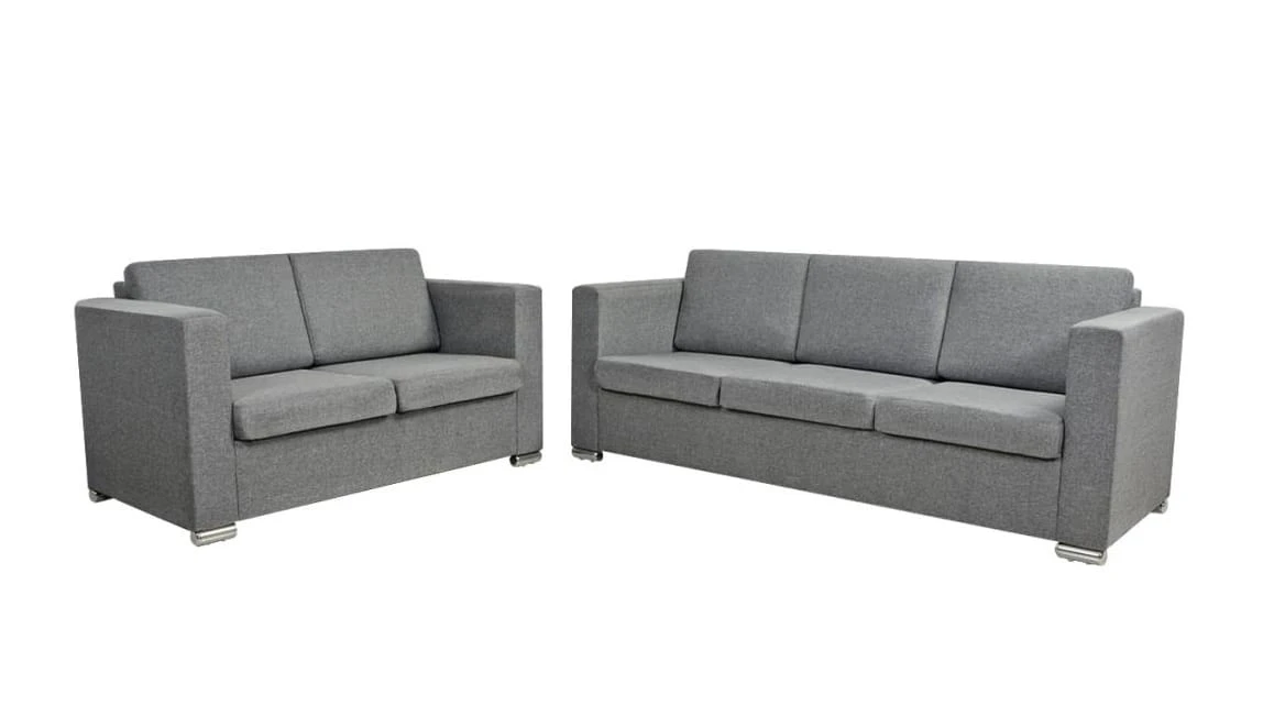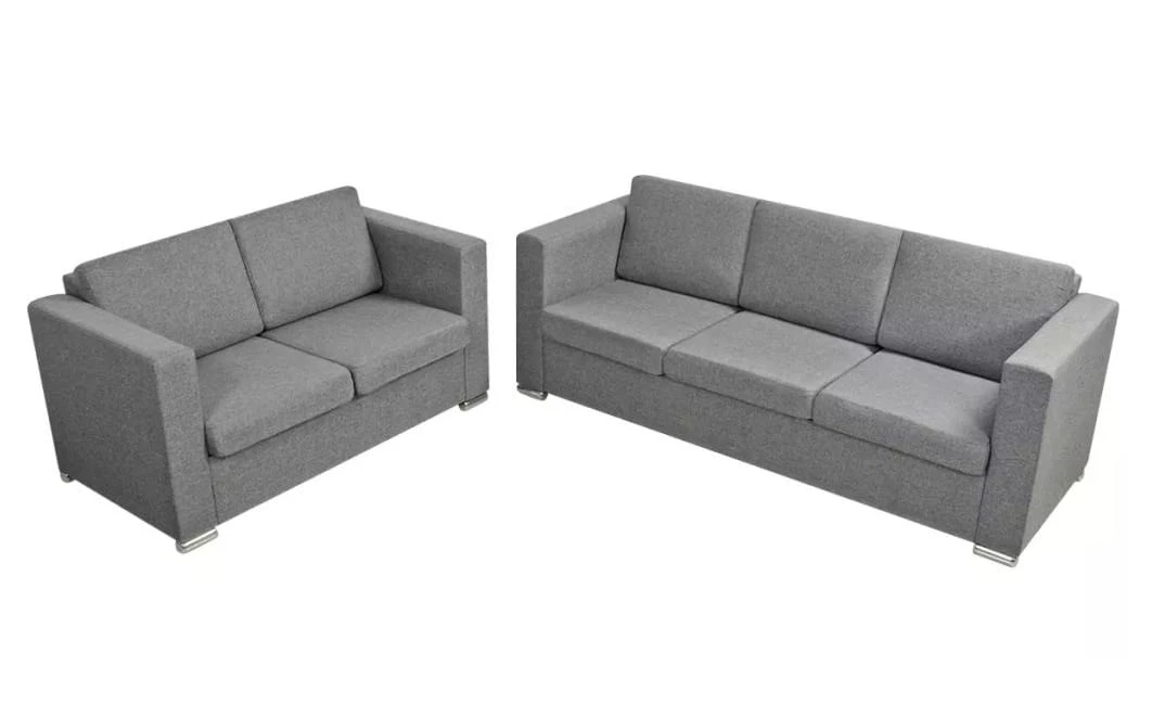 Sofa dwuosobowa i sofa trzyosobowa wchodzi w skład tego pięknego zestawu. Każda z nich wyposażona jest w komfortowe oparcia i grube poduszki, tapicerowane wysokiej jakości trwałą tkaniną.
