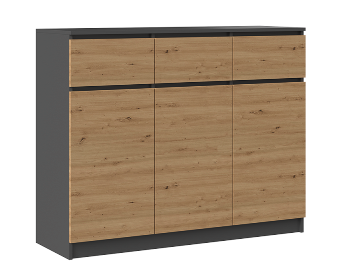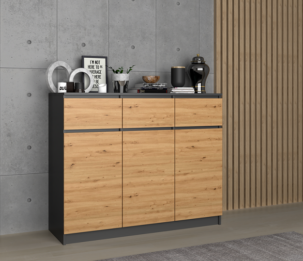 Uniwersalna komoda loftowa Isla w kolorze antracyt z dębem artisan to funkcjonalny mebel, który pomoże urządzić wnętrze Twojej sypialni, salonu lub przedpokoju. Nowoczesny i minimalistyczny wygląd sprosta wszystkim, którzy lubią połączenie designerskiego stylu z funkcjonalnością. Wnętrze komody składa się z szuflad i półek, które pomogą w rozmieszczaniu przechowywanych rzeczy. Nasza komoda loftowa Isla doskonale sprawdzi się także w biurze. Zmieścisz w niej bez trudu ważne dokumenty i segregatory. Możesz jej także użyć w swojej garderobie. Poskładane w kostkę ubrania znajdą swoje miejsce na półkach szafki.