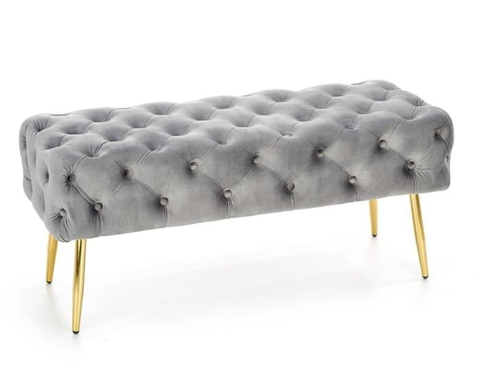 Ławka posiada cztery nogi, które zostały wykonane ze stali chromowanej, dzięki czemu są wytrzymałe. Co więcej, nogi zostały pomalowane na przepiękny złoty kolor, który podkreśla wyjątkowość mebla i bezsprzecznie komponuje się z tapicerką siedziska. Na spodzie umieszczono czarne nakładki chroniące powierzchnie podłogi.