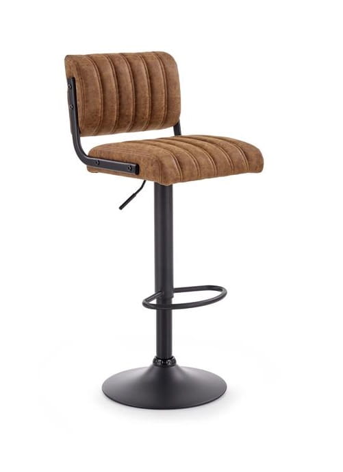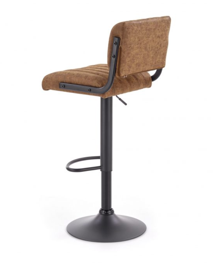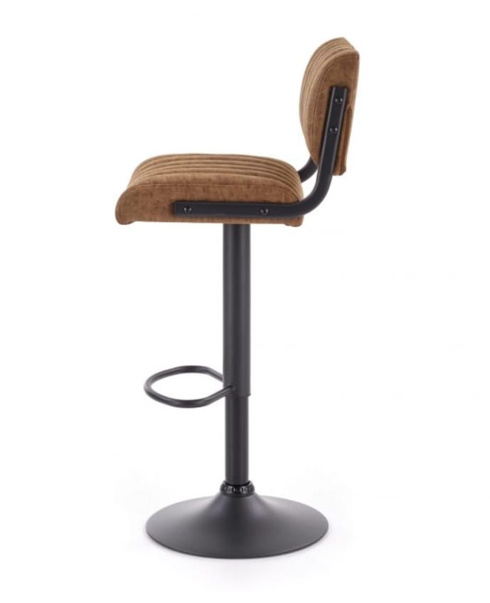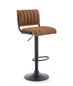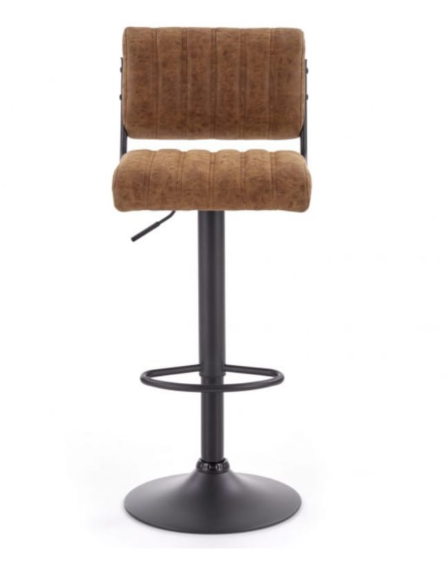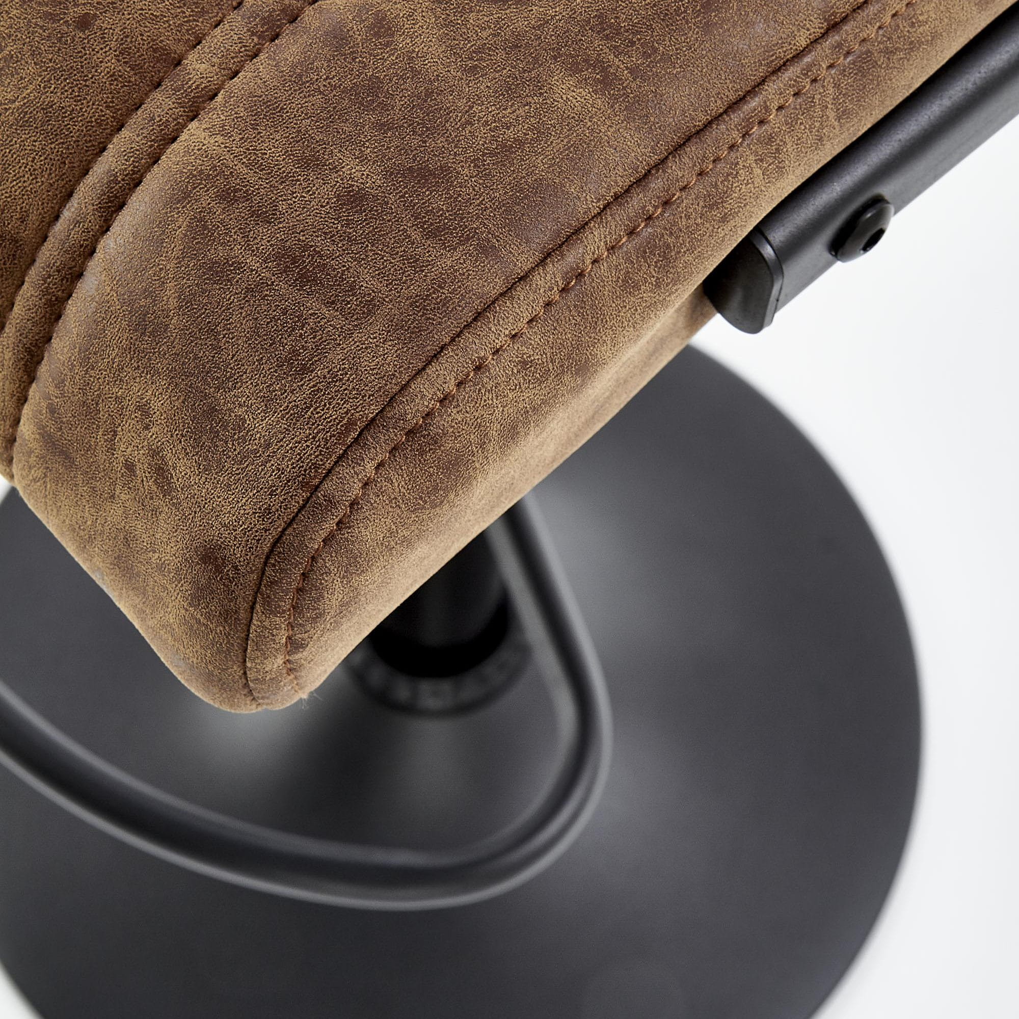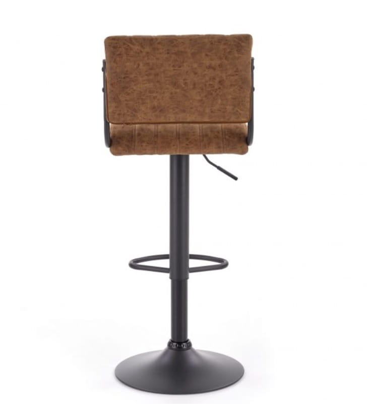 Hoker ten wykonany jest na solidnej, bo metalowej podstawie, malowanej na czarno metodą proszkową i z praktyczną, wygodną podpórką na nogi. Jest on tapicerowany wytrzymałą miękką ekoskórą, w ciepłym kolorze brązowym. Siedzisko i oparcie zdobione są przeszyciami, które uatrakcyjniają wygląd tego niebanalnego mebla.