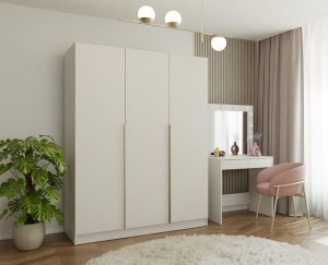 Trzydrzwiowa szafa kaszmir Syri II stanowi część starannie skomponowanej kolekcji Egbe, co daje Ci możliwość stworzenia w swoim domu spójnej, harmonijnej aranżacji poprzez połączenie jej z pasującą toaletką, komodą czy regałem z naszej oferty, tworząc tym samym wnętrze o przemyślanym, profesjonalnym charakterze, które będzie Cię cieszyć przez lata.