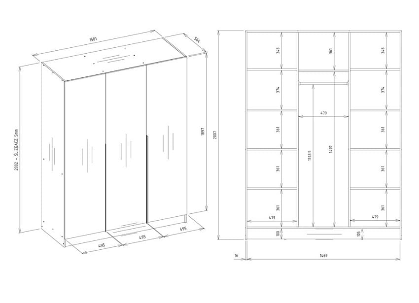 - Wymiary: szerokość - 150 cm, głębokość - 56,5 cm, wysokość - 200 cm