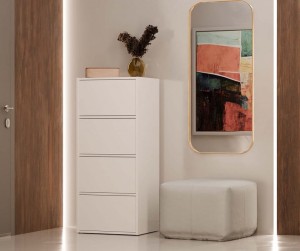 W świecie, gdzie funkcjonalność coraz częściej idzie w parze z designem, szafka Mata wyróżnia się swoją uniwersalnością. Ten niepozorny, a jednocześnie przemyślany mebel płynnie przystosowuje się do różnorodnych pomieszczeń – od ruchliwego przedpokoju, przez nastrojową sypialnię, aż po twórczą przestrzeń domowego biura czy pokoju dziecięcego. Jest jak kameleon wnętrzarski, który odnajduje się w każdej roli. Jej minimalistyczna sylwetka, ubrana w klasyczną biel, stanowi doskonałe tło dla każdego stylu aranżacyjnego – od skandynawskiej prostoty, przez industrialną surowość, po eklektyczną odwagę. To mebel, który nie konkuruje z otoczeniem, lecz subtelnie je dopełnia, wprowadzając harmonię i ład.