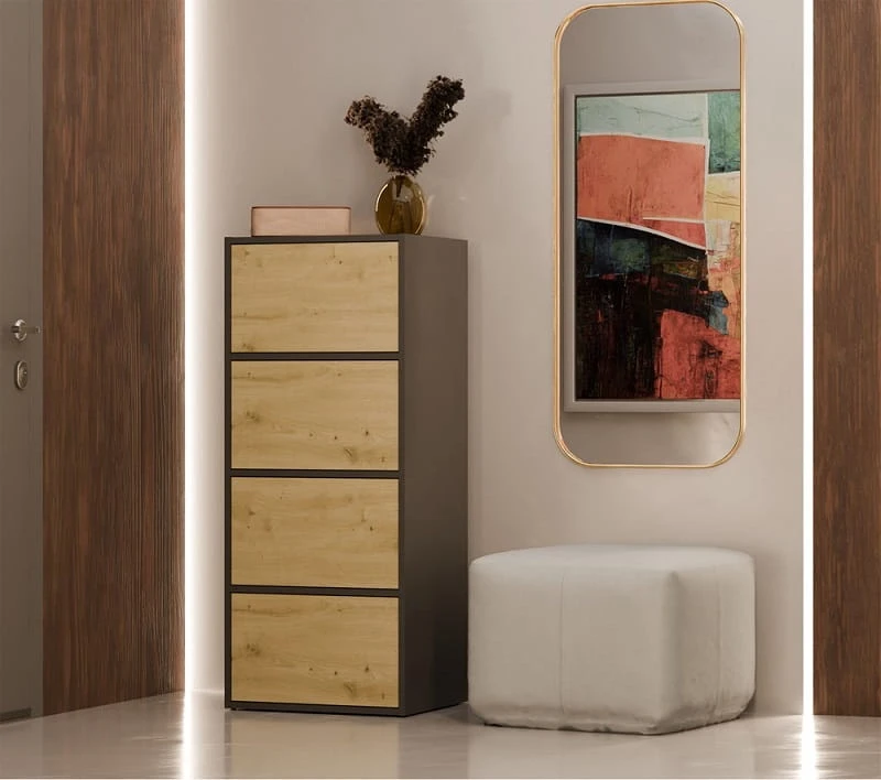 W świecie, gdzie funkcjonalność coraz częściej idzie w parze z designem, szafka Mata wyróżnia się swoją uniwersalnością. Ten niepozorny, a jednocześnie przemyślany mebel płynnie przystosowuje się do różnorodnych pomieszczeń – od ruchliwego przedpokoju, przez nastrojową sypialnię, aż po twórczą przestrzeń domowego biura czy pokoju dziecięcego. Jest jak kameleon wnętrzarski, który odnajduje się w każdej roli. Jej minimalistyczna sylwetka stanowi doskonałe tło dla każdego stylu aranżacyjnego – od skandynawskiej prostoty, przez industrialną surowość, po eklektyczną odwagę. To mebel, który nie konkuruje z otoczeniem, lecz subtelnie je dopełnia, wprowadzając harmonię i ład.