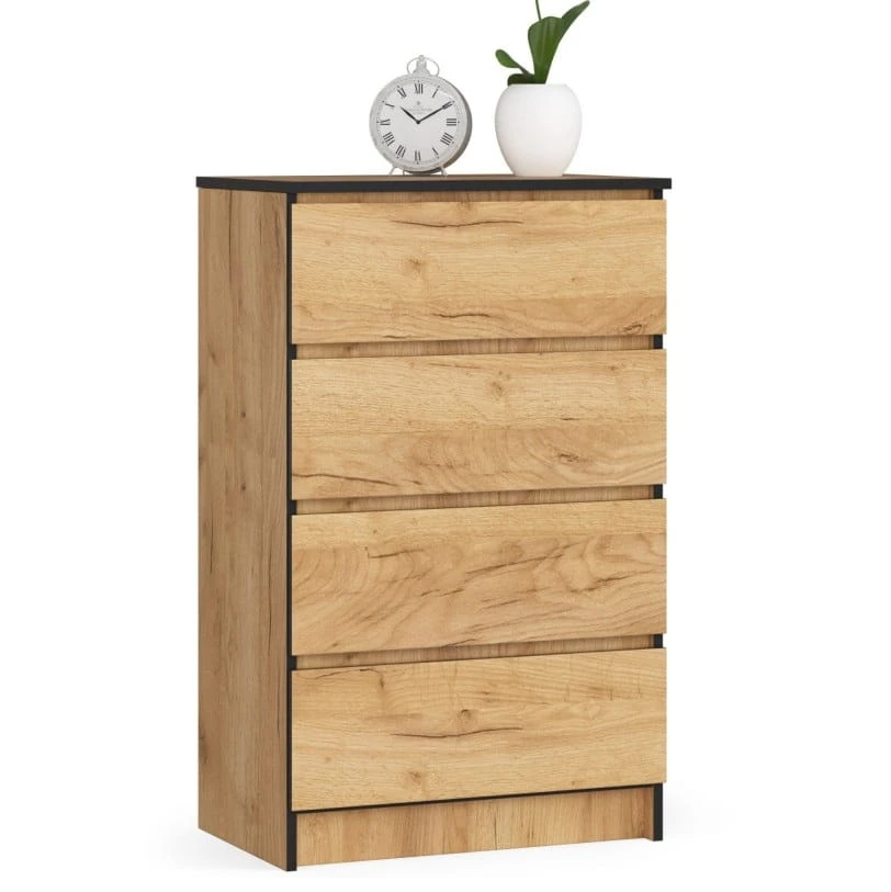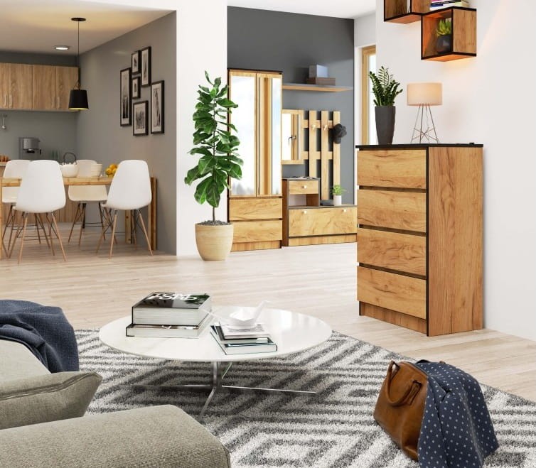 Wysoka komoda z szufladami jest elementem umeblowania, który dzięki swojej nietuzinkowej formie i prostemu kształtowi doskonale wpisze się w aranżację nowoczesnego salonu, sypialni, a nawet przedpokoju. Mebel wykonano z trwałej płyty laminowanej, a praktyczna okleina sprzyja łatwemu utrzymaniu go w czystości. Oferowana przez nas komoda posiada aż 4 pojemne szuflady o czołach znakomicie dopasowanych do frontu mebla.