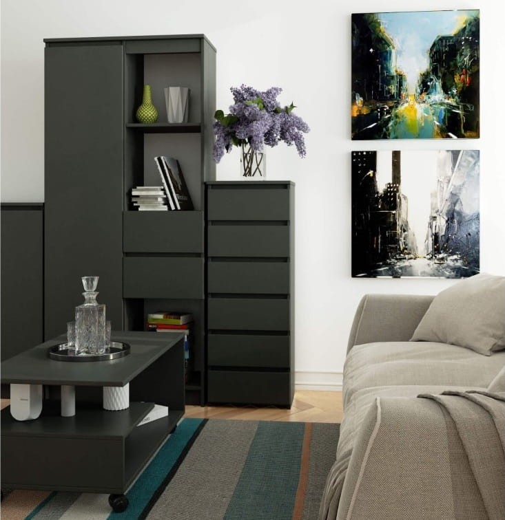 Komoda z szufladami z kolekcji Dorian o szerokości 40 cm to kwintesencja stylu i funkcjonalności. Zastosowany kolor grafit szary mat sprawia, że komoda prezentuje się bardzo elegancko, pasując zarówno do nowoczesnych, jak i klasycznych aranżacji. Ponadto, jej uniwersalność sprawia, że doskonale odnajdzie się w różnych pomieszczeniach samodzielnie, jak i jako element kolekcji.