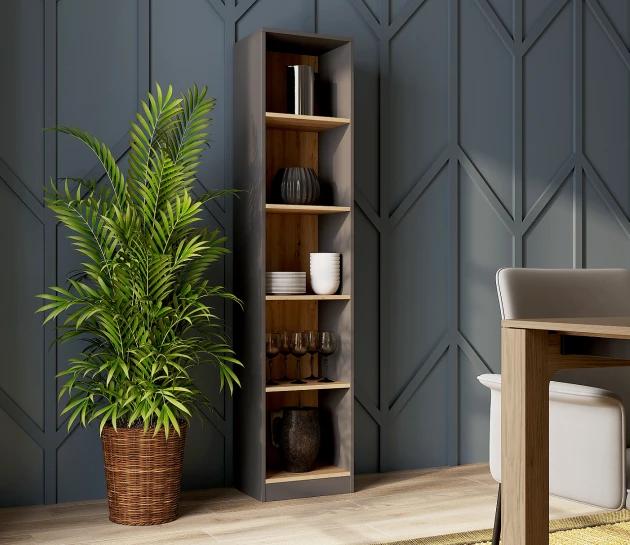 Wąski regał Isla prezentuje się naprawdę okazale. Nie bez znaczenia jest tutaj jego wymiar. 182 cm wysokości i 40 cm szerokości to powierzchnia, która ozdobi nawet niewielkie wnętrze. Można świetnie ją wykorzystać, szczególnie, że optymalna jest tutaj głębokość półek (30 cm). Ta domowa biblioteka jest niezwykle przestronna i solidna!