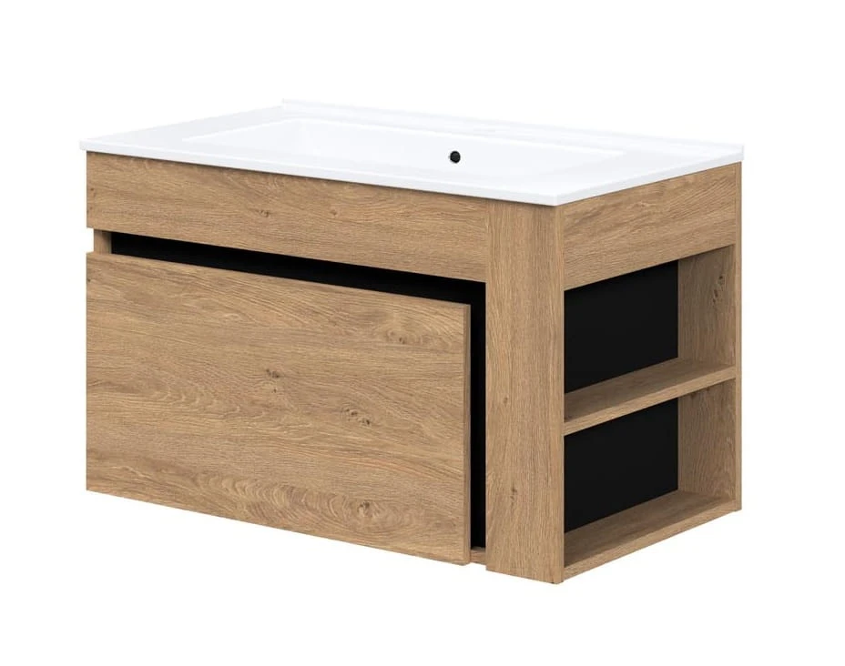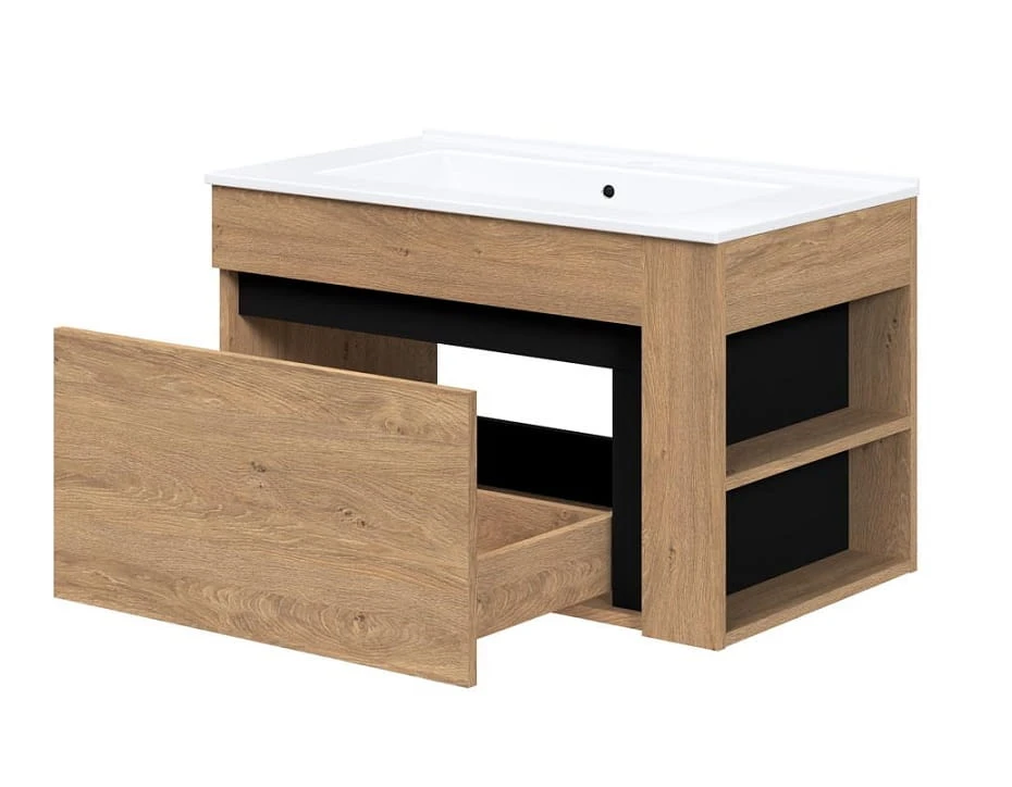 Odkryj nowy wymiar komfortu i stylu w Twojej łazience z wisząca szafką pod umywalkę Desog. Ten niezwykły mebel, łączący w sobie nowoczesny design z ponadczasową funkcjonalnością, stanie się prawdziwą ozdobą Twojego wnętrza, jednocześnie zapewniając praktyczne rozwiązania na co dzień. Szafka Desog, wykonana w ciepłym odcieniu dębu złotego z subtelnymi czarnymi akcentami, idealnie wpasuje się zarówno w nowoczesne, jak i klasyczne aranżacje. Ta uniwersalna kolorystyka sprawia, że mebel z łatwością zharmonizuje się z różnorodnymi stylami wykończenia łazienki, dodając jej eleganckiego charakteru.