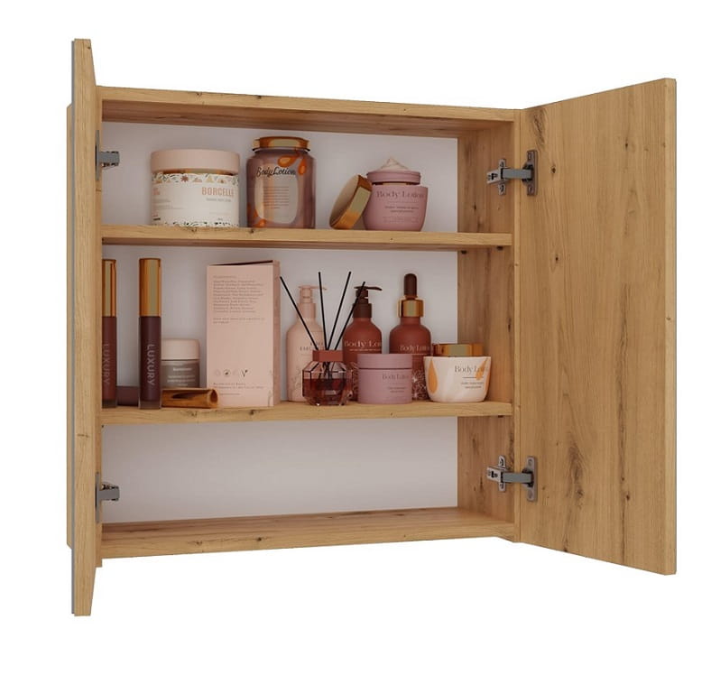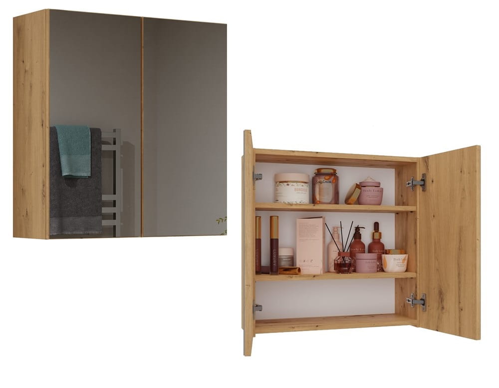 Szafka nad umywalkę Mirro ma wymiary 60 cm szerokości, 60 cm wysokości i 22 cm głębokości, co sprawia, że jest ona wprost idealnym rozwiązaniem dla łazienek o ograniczonej przestrzeni. Wykonana z wysokiej jakości płyty laminowanej o grubości 16 mm, ze szklanym lustrem na frontach drzwi, jest nie tylko praktyczna, ale i estetyczna.