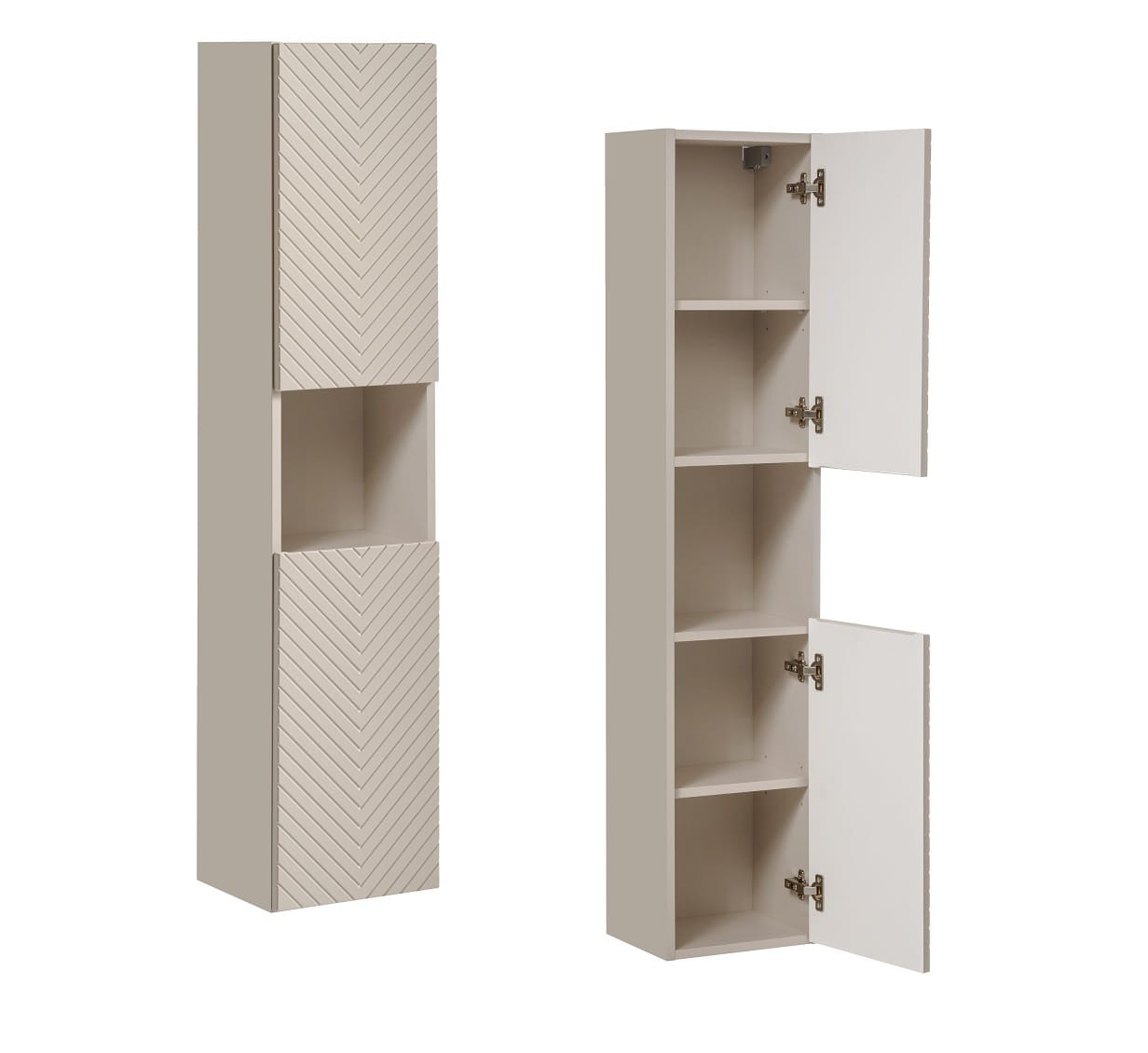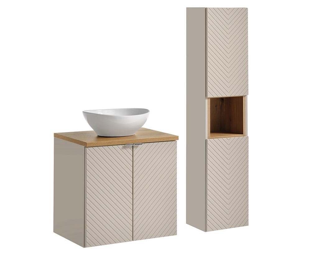 Ten wyjątkowy zestaw wiszących mebli łazienkowych zachwyca już na pierwszy rzut oka wyrafinowanym połączeniem ciepłego odcienia cashmere z ryflowanymi frontami ułożonymi w elegancką jodełkę. Geometryczny wzór w połączeniu z matowym wykończeniem nadaje meblom niepowtarzalny charakter, idealnie wpisujący się w aktualne trendy wzornicze. Komplet składa się z trzech starannie zaprojektowanych elementów: pojemnej szafki podumywalkowej wyposażonej w funkcjonalne półki, smukłego słupka z dodatkowymi przestrzeniami do przechowywania oraz blatu w naturalnym odcieniu dębu, zwieńczonego elegancką umywalką nadblatową w klasycznej bieli.