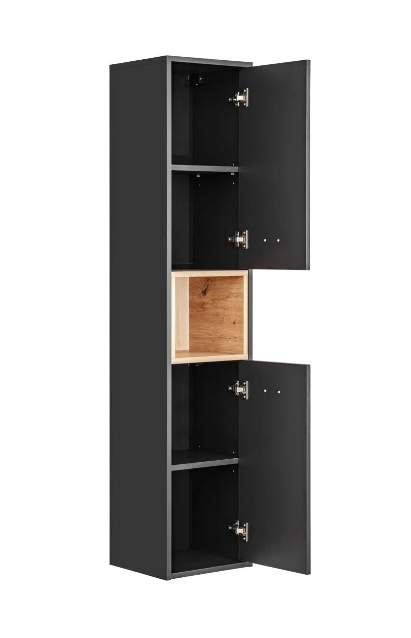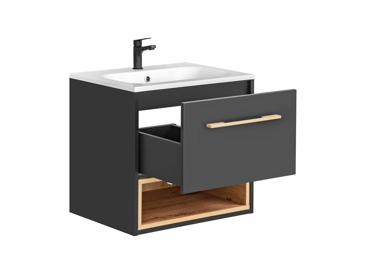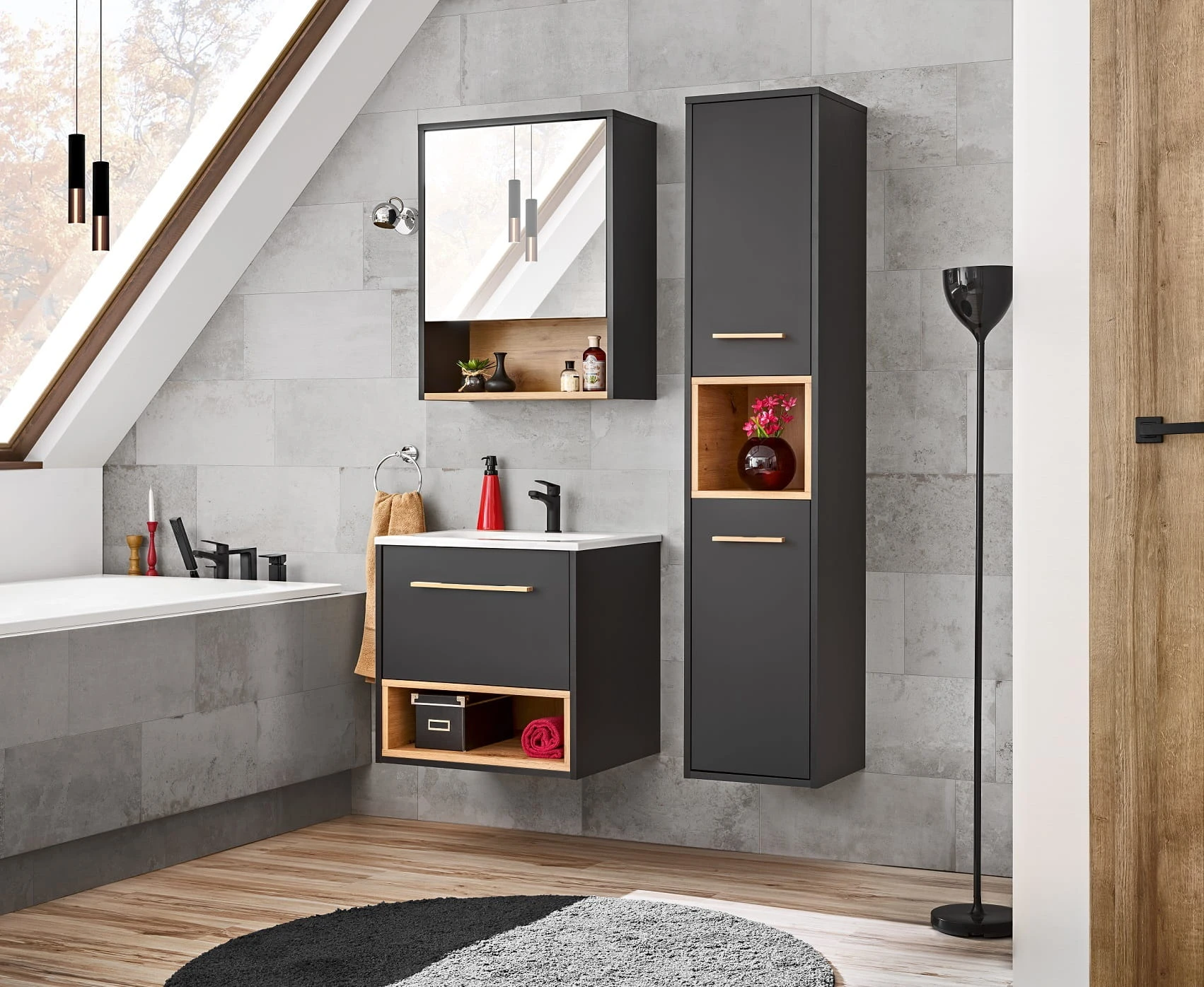 Meble do łazienki z prezentowanego zestawu charakteryzują się stylową elegancją. Korespondują ze sobą, mają ultra modną kolorystykę, gdzie łączy się szary cosmos z dębem artisan.
