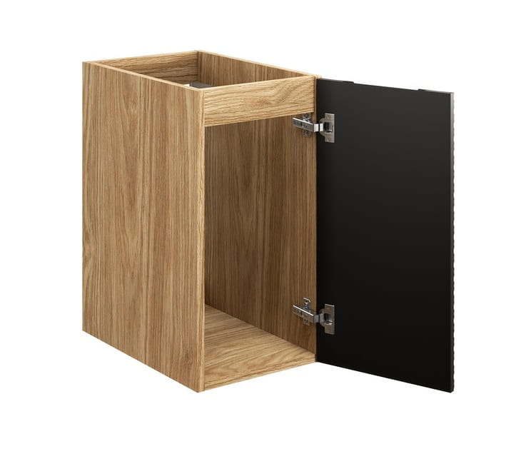 Starannie przemyślana kompozycja kolorystyczna łączy w sobie ciepło naturalnego dębu olejowanego, użytego na korpusach mebli i eleganckim blacie, z głęboką czernią frontów. Ta kontrastowa harmonia nie tylko podkreśla designerski charakter kolekcji, ale również wprowadza do wnętrza atmosferę spokoju i ponadczasowej elegancji. Naturalna struktura drewna, widoczna w wykończeniu korpusów i blatu, gwarantuje nie tylko walory estetyczne, ale również wyjątkową trwałość i odporność na upływ czasu.
