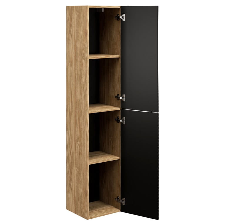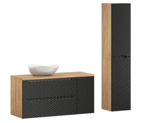 Zestaw Ocean Black został zaprojektowany z myślą o funkcjonalnej organizacji przestrzeni łazienkowej. Głównym elementem kompozycji jest ergonomiczna szafka podumywalkowa o szerokości 90 cm wyposażona w pojemne szuflady, której towarzyszy kompaktowa szafka podblatowa o szerokości 30 cm. Całość zwieńczona jest eleganckim blatem w kolorze dębu olejowanego o szerokości 120 cm, który tworzy spójną powierzchnię użytkową. Designerska, ceramiczna umywalka w kształcie łezki nie tylko przyciąga wzrok swoją formą, ale również zapewnia wysoki komfort codziennego użytkowania. Kompozycję uzupełnia przestronny słupek wiszący o wysokości 170 cm, którego praktyczne półki oferują dodatkową przestrzeń do przechowywania.