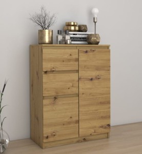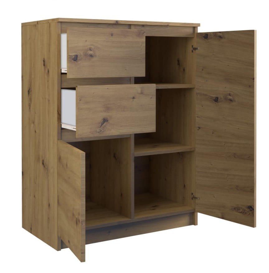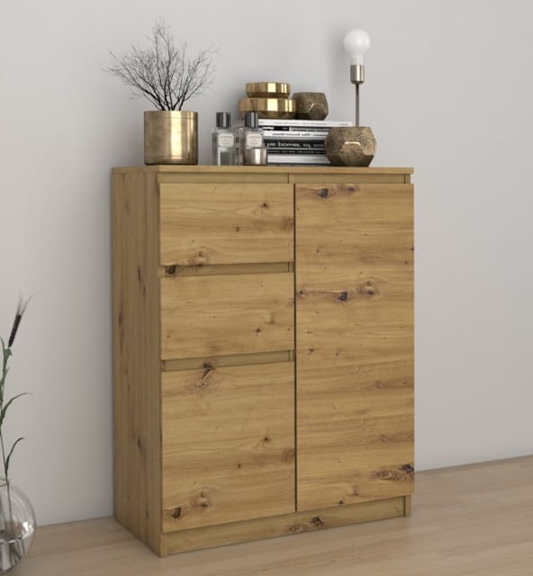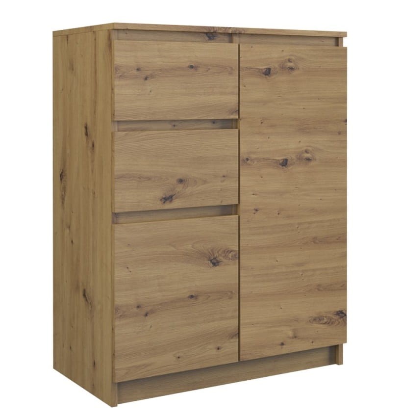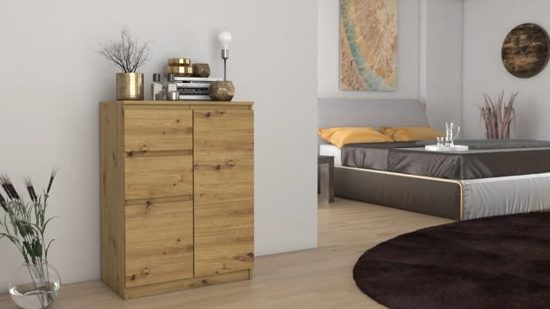 Uniwersalna komoda z serii Romes w kolorze dąb artisan to funkcjonalny i pakowny mebel, który urządzi wnętrze Twojej sypialni, salonu lub pokoju dziecka. Nowoczesny i minimalistyczny wygląd sprosta oczekiwaniom wszystkich, którzy cenią połączenie prostoty i elegancji. Wnętrze komody składa się z półek oraz szuflad, które pomogą przy rozmieszczaniu rzeczy. Łatwiej będzie znaleźć to, czego się szuka.
