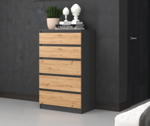 Wysoka komoda z szufladami jest elementem umeblowania, który dzięki swojej nietuzinkowej formie i prostemu kształtowi doskonale wpisze się w aranżację nowoczesnego salonu, sypialni, a nawet przedpokoju. Mebel wykonano z trwałej płyty laminowanej, a praktyczna okleina sprzyja łatwemu utrzymaniu go w czystości. Oferowana przez nas komoda posiada aż 5 pojemnych szuflad o czołach znakomicie dopasowanych do frontu mebla.