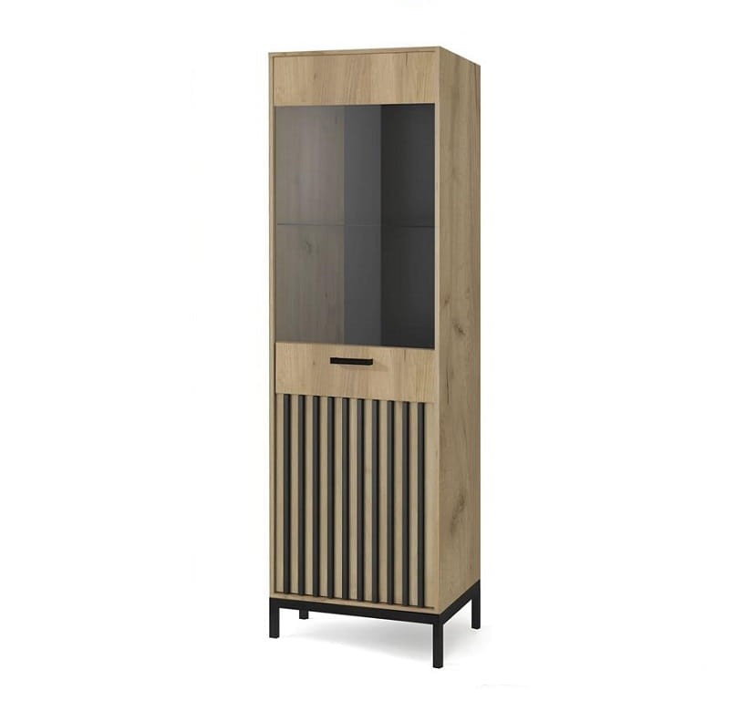 Dzięki czarnym nóżkom, nasza witryna nabiera elegancji i lekkości. Wysokie nóżki nadają jej loftowego zacięcia, jednocześnie ułatwiając utrzymanie podłogi pod nią w czystości. Front witryny podzielony jest na dwie części: górną z przezroczystą szybą, idealną do eksponowania eleganckiej zastawy stołowej czy szkła, oraz dolna część z lamelami na płycie, która doskonale nadaje się do przechowywania podręcznych drobiazgów lub dokumentów.