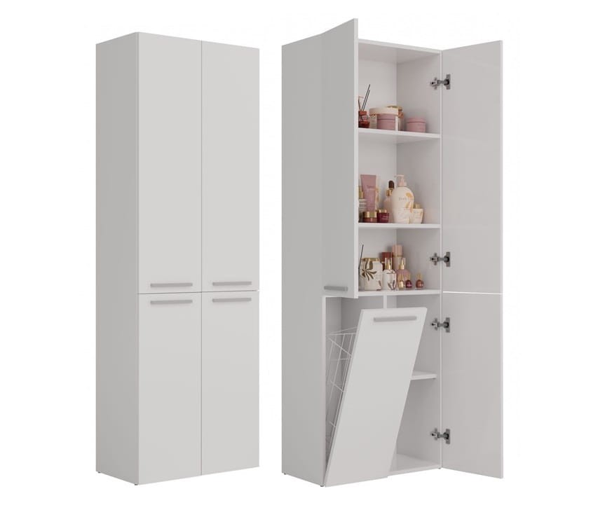 Dzięki przemyślanej konstrukcji o szerokości 60 cm, szafa Mare doskonale sprawdzi się zarówno w niewielkich, jak i przestronnych pomieszczeniach. Dwusegmentowy układ szafki zapewnia optymalne wykorzystanie dostępnej przestrzeni, oferując miejsce zarówno na kosmetyki, jak i na pranie.