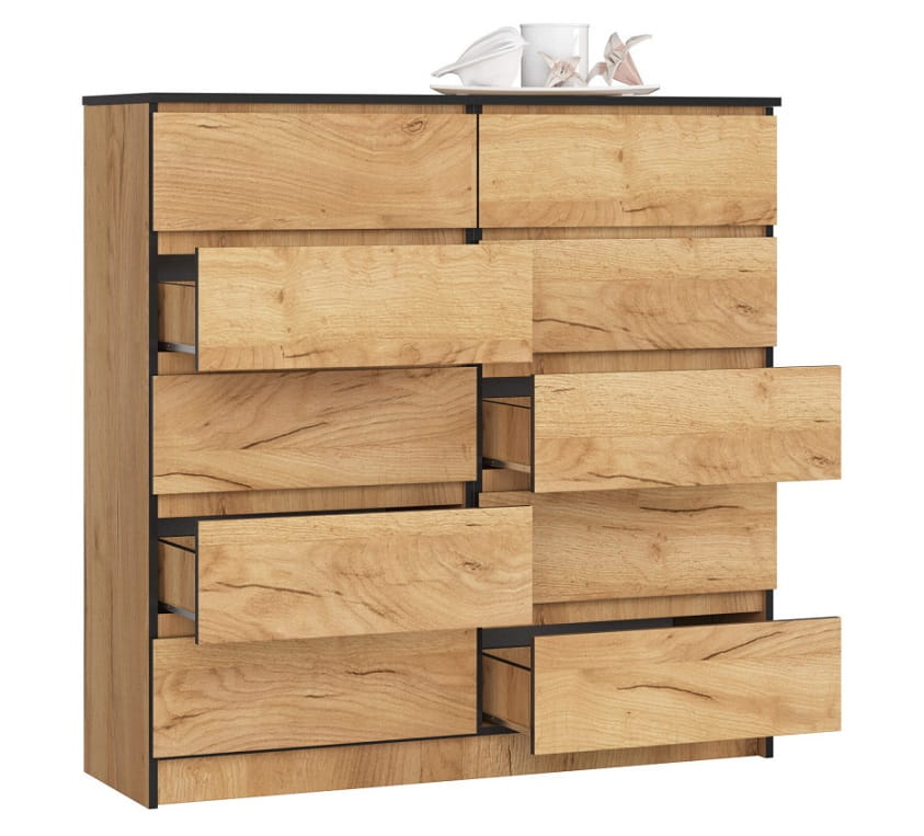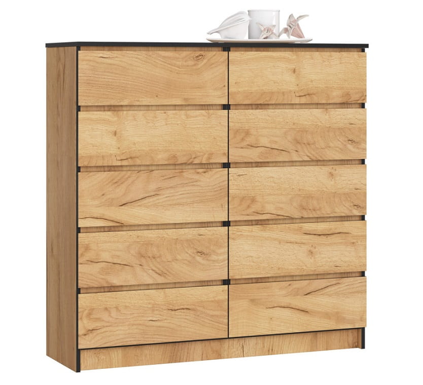 Komoda wykonana jest z laminowanej płyty meblowej o standardowej grubości 16 mm. Pokrywający płyty laminat jest twardy, odporny na uszkodzenia o charakterze mechanicznym – zadrapania, zarysowania, niewielkie uderzenia. Powierzchnię wierzchu mebla można czyścić środkami do pielęgnacji drewna, łagodnym detergentem i ciepłą wodą oraz miękką szmatką, np. z mikrowłókna.