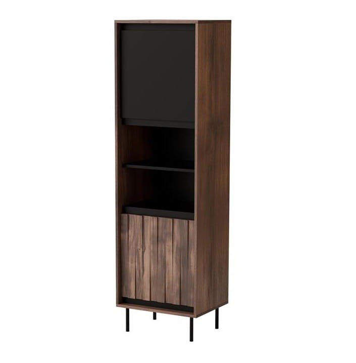 Jej fronty z fascynującą strukturą 3D wyróżniają tę serię spośród innych, nadając jej niepowtarzalny charakter. Matowa czerń perfekcyjnie komponuje się z orzechowymi detalami, tworząc harmonijną kompozycję, która dodaje pomieszczeniu nowoczesności i stylowego charakteru. Ta nowoczesna witryna łączy w sobie klasyczną elegancję z innowacyjnym designem. Stalowe nóżki dodają lekkości i finezji, podkreślając lekki, unoszący się charakter mebli z kolekcji Ramzes. Ta wąska witryna została zaprojektowana nie tylko jako miejsce do przechowywania, ale również jako ozdoba przestrzeni, która przyciąga uwagę swoim wyjątkowym urokiem.