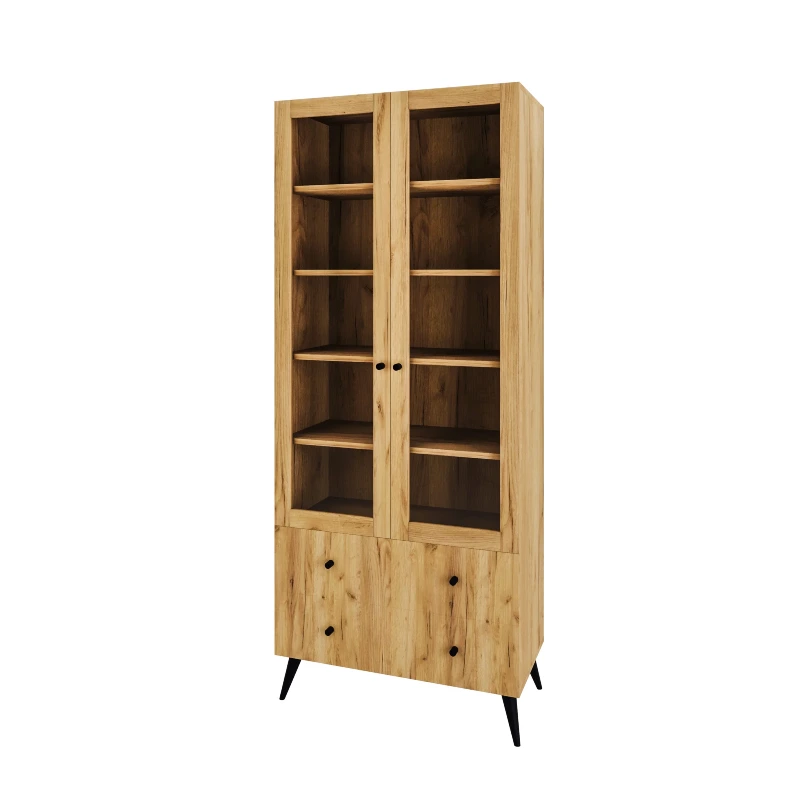 Witryna Albi zachwyca nie tylko pojemnością, ale także designem. Drewniane nóżki dodają lekkości całej konstrukcji i ułatwiają utrzymanie porządku pod meblem. Dzięki nim witryna unosi się nad podłogą, co optycznie powiększa przestrzeń i dodaje wnętrzu nowoczesnego charakteru.