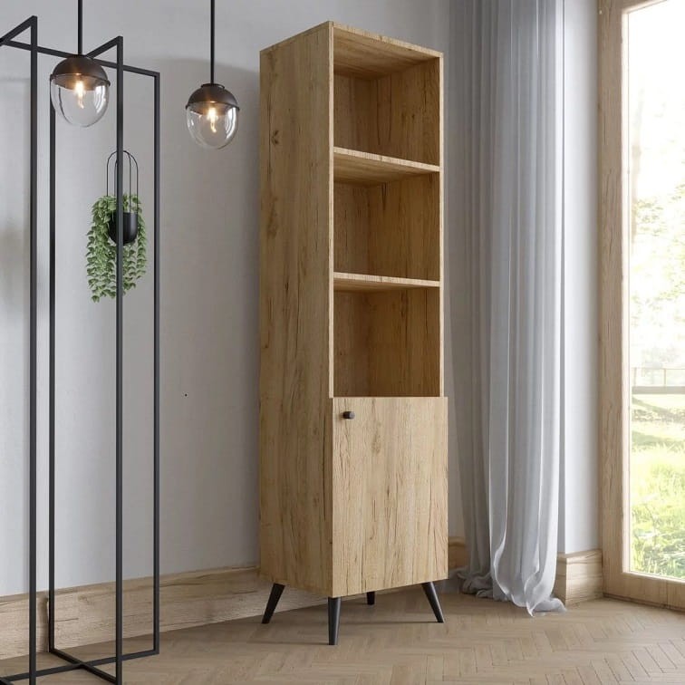 Głównym atutem tej wysokiej witryny są trzy głębokie półki, na których z dumą prezentować można zastawę stołową, oryginalne bibeloty, książki czy inne przedmioty. Otwarte półki pozwalają na efektowną ekspozycję, a to może dodać każdemu wnętrzu unikalnego charakteru.To także idealne miejsce na przechowywanie wszelakich akcesoriów, co pozwoli zachować porządek i mieć wszystko w dostępnym miejscu. Służą temu dwie dyskretne półki ukryte za drzwiczkami.