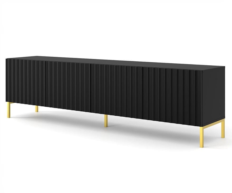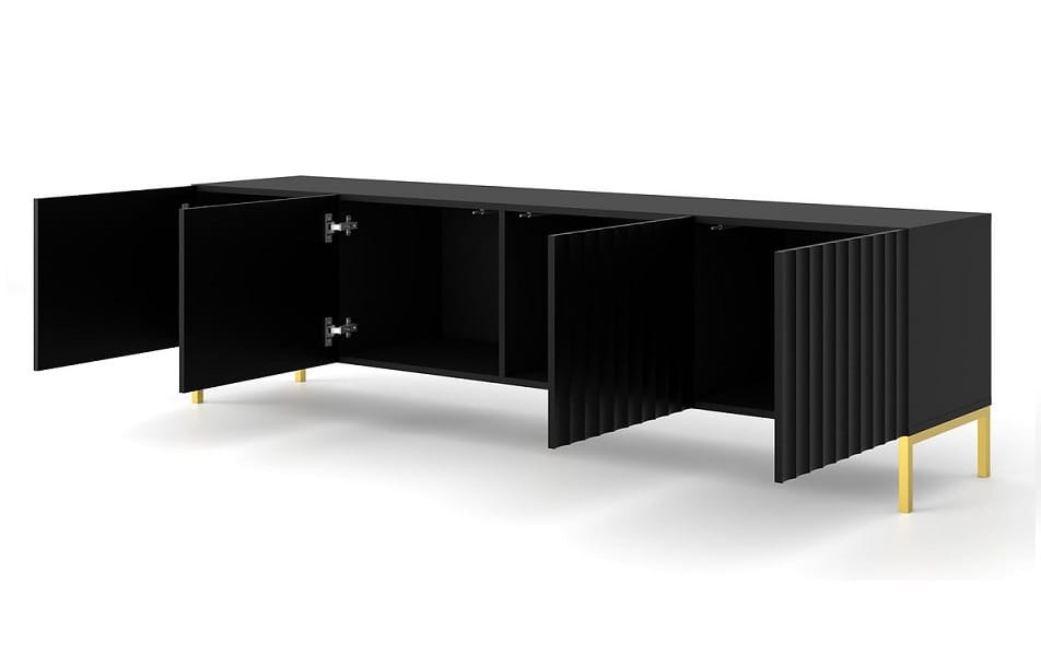 Niska szafka pod telewizor Golden Waler nie tylko zachwyca designem, ale także cechuje się solidną konstrukcją i trwałością. Korpus z płyty laminowanej o grubości 16 mm oraz frezowane fronty z płyty MDF gwarantują wytrzymałość na długie lata. Dodatkowo, eleganckie metalowe nóżki w złotym odcieniu podkreślają wyjątkowy charakter mebla i zapewniają stabilność.