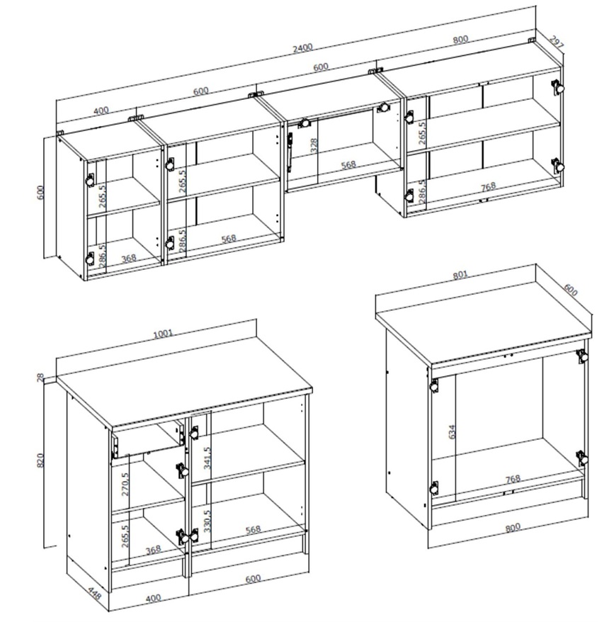 - Materiał: fronty szafek dolnych wykonane z MDF, podnośniki gazowe, blat grubości 28 mm