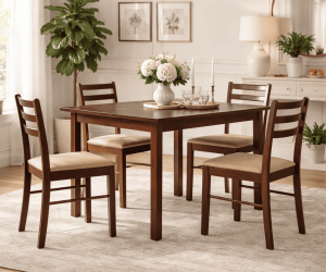 Poszukujesz praktycznego zestawu do kuchni lub jadalni? Przedstawiamy drewniany zestaw do kuchni i jadalni Dolore. Wyjątkowo praktyczny stół w komplecie z 4 krzesłami, który sprawdzi się w wielu pomieszczeniach, wykonany został z litego drewna kauczukowego. Może być doskonałym rozwiązaniem do przestronnej i komfortowej jadalni, kuchni czy nawet restauracji. Optymalne rozmiary pozwolą na przyjemne i wygodne spożywanie posiłków w towarzystwie bliskich osób. Uniwersalny wygląd stołu pozwala na łączenie go z innymi meblami i tworzenie niepowtarzalnych oraz wyjątkowych kompozycji. Stabilna konstrukcja gwarantuje długoletnie użytkowanie. Stół ten będzie się pięknie prezentował we wnętrzach nowoczesnych, które zdecydowanie ociepli i rozjaśni.