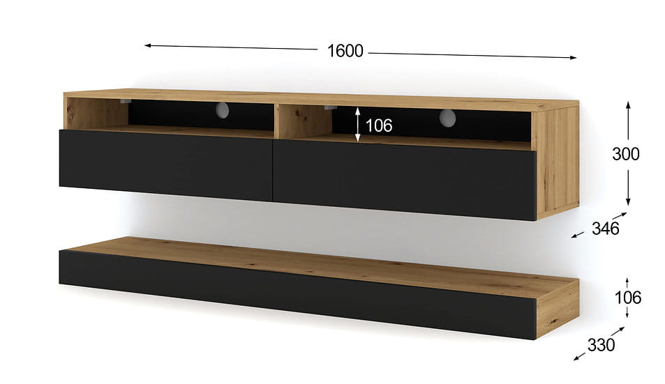 - Wymiary: szerokość - 160 cm, głębokość elementu wiszącego - 34,6, wysokość elementu wiszącego - 30 cm, głębokość panela - 33 cm, wysokość panela - 10,6 cm, wysokość otwartej półki - 10,6 cm